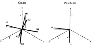 Six rotational axes about which the extraocular muscles turn the eye and the three rotational axes about which the vestibular semicircular canals measure head-movement. According to tensor network theory, a metric tensor can be determined to connect the two coordinate systems.