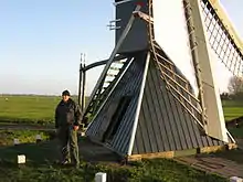 The original windmill was built in the eighteenth century and located near Grou and called Minne Finne. The mill was moved to Sneek in 1982 and renamed Himmole, though the Minne Finne was in such a bad state of repair that its relocation was in fact a reconstruction with no[2][3] or very few parts[4] of the original windmill being reused. The new mill was also quite a bit larger than the old mill. The mill was built here as compensation for the loss of the windmill 't Op of Oppenhuizen (part of Sneek) that was moved to Koudum. The new location near Sneek deteriorated from growing trees, nearby buildings and a new road. In 2011 the windmill was moved again, this time to IJlst, only 300 metres from timber windmill De Rat.[5] This is the location where the first Terpensmole was built some time before 1832 and stood into the twentieth century,[6] so the moved mill has been given this historic name.[4]