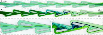 (b) Reverse direction. The filaments ricochet off the periodic structures, deflecting increasingly sharply before being rerouted around the 'islands' and mixing.
