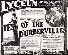 Tess of the d'Urbervilles is a 1924 American silent drama film starring Blanche Sweet and Conrad Nagel.[1][2] It was directed by Sweet's husband, Marshall Neilan. The film is the second motion picture adaptation of the 1891 novel by Thomas Hardy, which had been turned into a very successful 1897 play starring Mrs. Fiske.[3] In 1913, Adolph Zukor enticed Mrs. Fiske to reprise her role in a film version which is now considered lost. The 1924 version is also considered lost.[4]
