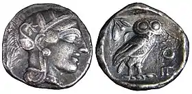 The Athenian tetradrachme was widely used in transactions throughout the ancient Greek world, including in cities politically unfriendly to Athens.[2] Athens had silver mines in state ownership, which provided the bullion. Most well known were the silver mines of Laurium in Athenian countryside.[3] The Athenian tetradrachm was stamped with the head of Athena on the obverse, and on the reverse the image of the owl of Athena, the iconographic symbol of the Athenian polis, with a sprig of olive and a crescent for the moon. According to Philochorus, it was known as glaux (γλαύξ, 'little owl')[4] throughout the ancient world[5] and "owl" in present-day English language numismatics.[6] The design was kept essentially unchanged for over two centuries, by which time it had become stylistically archaic. To differentiate their currency from the rival coinage of Aegina using the Aeginetic stater of about 12.3 grams, Athens minted its tetradrachm based on the "Attic" standard of 4.3 grams per drachma. The vast number of "owls-tetradrachms" available those days mainly from the silver mines of Laurium financed the several achievements of Athens, such as the reconstruction of the Acropolis and building the Parthenon, as well as many wars, including the Peloponnesian War.