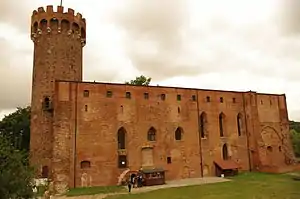 Teutonic Castle in Świecie (Polish: Zamek krzyżacki w Świeciu) is a partial ruin located in Świecie.[1] The partial ruin is kept in full-shape from the bank of the river Vistula and Wda - together with a circular tower topped with merlons. The castle is part of a complex built by the Teutonic Knights in the Gothic architectural style.[2] The castle was built on the site of a Pomeranian dukes' gord - located by the site of the castle. Formerly the castle had four corner towers, one of which survived. The castle is surrounded by a defensive wall and a moat. In 1410 the castle was looted by Polish forces obliterated the castle. The castle was owned by the Kingdom of Poland after the Second Peace of Thorn in 1466. In the sixteenth century, Castellan Konopacki reconstructed the castle into the Renaissance architectural style. The castle was devastated after the Deluge and since then was not rebuilt. The castle was furthermore devastated after Prussian forces used the castle as training grounds. Currently the castle houses a museum, with the tower and castle renovated.[3]