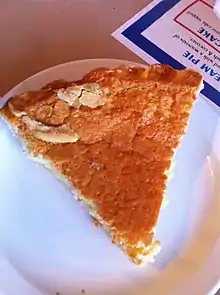 Pecan pie is the official state pie of Texas. The crust for another local specialty, peanut butter pie, is made with crushed vanilla wafers and peanuts. The filling is a sweetened peanut butter pudding made with milk, sugar, peanut butter, corn starch and egg yolks.[10]