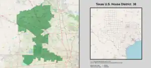 Texas's 38th congressional district is a congressional district in Texas, covering parts of Harris County. It includes the Houston suburbs of Jersey Village, Cypress, Tomball, Katy, and Klein.[3] The Memorial Villages and a portion of the city of Houston are also located within the district.