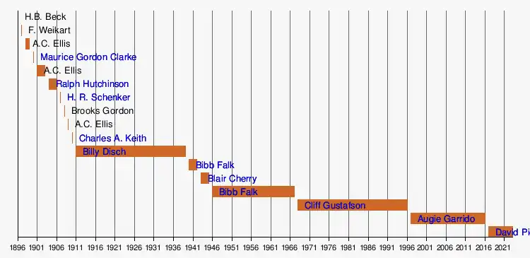 The Longhorn baseball program has been remarkably stable over the last century. Over a 105-year period (1911–2016), it had only four full-time coaches—Billy Disch (1911–1939), Bibb Falk (1940–1967), Cliff Gustafson (1968–1996), and Augie Garrido (1997–2016). David Pierce, previously head coach at Tulane University, was hired as Texas' fifth head coach on June 29, 2016.