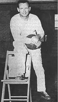 Hopes and expectations for the 1939–40 team were high, as all but one of the key players returned from the previous season's SWC champion and NCAA Tournament squad.[49] Texas opened the season with seven wins by an average of 18 points (and by no fewer than 11), including two wins over the Texas Tech Red Raiders in a home series that marked the first meetings between the two schools in basketball.[50] Gray was intent both upon raising national recognition of the program and upon toughening his team in the early part of the season for the conference slate ahead, and to both ends he sought to involve the Longhorns in intersectional competition against prominent teams in high-profile venues across the country.[46][49] Ned Irish, director of Madison Square Garden and a pioneer in the promotion of college basketball in the 1930s, had invited Gray's Longhorns to play Manhattan College as part of a doubleheader that included Southern California and Long Island University.[46] The UT Athletic Council agreed to fund the team's trip to New York for the contest, followed by a stop in Philadelphia to play Temple. In front of 18,425 fans, the Longhorns overwhelmed Manhattan by a score of 54–32, earning the praise of the New York sports media and basketball fans for their speed and the accuracy of their one-handed shooting, which Gray had popularized as a player and continued teaching as a coach.[49][51] Continuing on to Philadelphia, Texas fell 47–37 to Temple, winners of the first National Invitation Tournament two years prior.[52] Having lost one of two road contests against Arkansas and a road game against SMU in overtime, Texas entered the penultimate game of the season at 18–3 and tied at 8–2 in conference play with the preseason conference favorite Rice Owls—a team that the Longhorns had defeated on Rice's home court earlier in the season, 50–46.[53][54] In front of a raucous pro-Texas crowd of more than 8,000 fans packed into Gregory Gymnasium, the Longhorns suffered a one-point loss to the Owls, 42–41, to see their hopes of winning a second consecutive outright SWC championship dashed and their chances of even sharing the championship greatly diminished. Another painful defeat followed in the final game of the season, as the Longhorns fell to a 10–11 Texas A&M team in College Station, 53–52, on a long running shot from the Aggies' backup center in the final seconds.[52][53] Texas finished 18–5 with no invitation to a postseason tournament. The Premo-Porretta Power Poll retroactively assigned the 1939–40 Longhorn team a national ranking of No. 17.