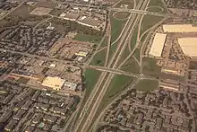 From there, the freeway proceeds north through Arlington near its boundary with Grand Prairie, where it interchanges with I-20 and then meets I-30. However, SH 360 and I-30 are not directly connected. As a legacy of the original toll road design of I-30 (formerly the Dallas-Fort Worth Turnpike), the highways connect only indirectly using long access roads that cross surface streets at lighted intersections.[2][3]