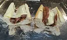 The Texas Tommy is a common dish at diners and greasy spoons in Philadelphia, eastern Pennsylvania, and southern New Jersey.[1][2] The dish's availability is widespread at restaurants in Philadelphia, and some cheesesteak restaurants in Philadelphia also offer the dish.[2] Little Pete’s restaurant, located in the Center City district of Philadelphia, was well known for serving the dish.[1] The Texas Tommy has been served at baseball games at Citizens Bank Park in Philadelphia, and in 2012, the dish was listed on the Serious Eats list of The Craziest Major League Baseball Hot Dogs of 2012.[8] The version served at Citizens Bank Park included the addition of chili.[8] Additionally, some hot dog restaurants in other areas of the United States include the Texas Tommy on their menus.[9][10]