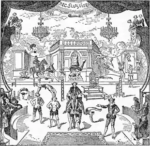 Nicolet's small boulevard theatre had been put up by Antoine Fouré for the purpose of presenting spectacle mécanique in the manner of Servandoni. The term spectacle mécanique often referred to puppet shows, but in this case it more likely meant a small stage with scenic effects and cut-out flats as moving figures. When Nicolet acquired the use of the theatre he reconstructed it to suit his needs.[6] One of the major advantages of the new location, besides its popularity, was that performances could be presented year round, rather than intermittently, as was the case at the fairs. Thus Nicolet could begin to compete with the more established theatres in the heart of Paris.[12]