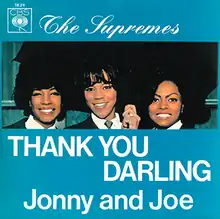"Thank You Darling" is a song by the American music group The Supremes. Released exclusively in Europe, it is one of two Supremes' singles sung in German, the first being "Moonlight and Kisses". Both singles were written by Werner Scharfenberger and Fini Busch.[1] The B-side, "Jonny Und Joe", is based on their earlier single, "Come See About Me", with German lyrics by Kurt Feltz. "Thank You Darling" became The Supremes' fourth top-twenty hit on the German Singles Chart.