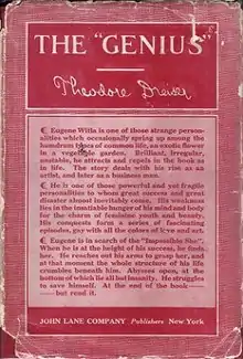 The "Genius" is a semi-autobiographical novel by Theodore Dreiser, first published in 1915. The story concerns Eugene Witla, a talented painter of strong sexual desires who grapples with his commitment to his art and the force of his erotic needs. The book sold 8,000 copies in the months immediately following publication but encountered legal difficulties when it was declared potentially obscene.[1] Dreiser's publisher was nervous about continuing publication and recalled the book from bookstores, and the novel did not receive broad distribution until 1923. When The "Genius" was reissued by a different publisher, the firm of Horace Liveright, it immediately sold more than 40,000 copies.[2]