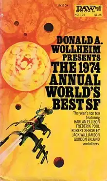 The 1974 Annual World's Best SF is an anthology of science fiction short stories edited by Donald A. Wollheim and Arthur W. Saha, the third volume in a series of nineteen. It was first published in paperback by DAW Books in May 1974, followed by a hardcover edition issued in September of the same year by the same publisher as a selection of the Science Fiction Book Club. For the hardcover edition the original cover art of Jack Gaughan was replaced by a new cover painting by Victor Valla. The paperback edition was reissued by DAW in December 1979 under the variant title Wollheim's World's Best SF: Series Three, this time with cover art by Vicente Segrelles. A British hardcover edition was published by The Elmfield Press in October 1975 under the variant title The World's Best SF Short Stories No. 1.