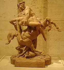 It is frequently supposed that Rodin, who was associated with Carrier-Belleuse's studio in the 1870s, contributed to the modeling; the general opinion is that, while the subject matter and the lines of Hippodamia exemplify Carrier-Belleuse's style, the expression and musculature of the centaur suggest Rodin.[1][3][lower-alpha 1]