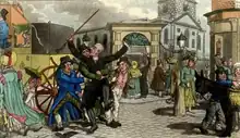 Many famous felons and highwaymen took the St Giles Bowl at the sign of the Angel, including John Cottington 'Mulsack' who picked Cromwell's pocket,[8] John Nevison 'Swift-Neck', and 'Handsome' Tom Cox who robbed the Kings Jester, Thomas Killgrew.[9] Perhaps the most famous scene to occur over the St Giles Bowl was the procession of the thief and popular hero 'Honest Jack' Sheppard to Tyburn, accompanied by as many as 200,000 citizens. According to one fictionalised telling, Sheppard refused the Bowl and instead pledged that his persecutor, the corrupt thief taker Jonathon Wild, would taste of the cup within six months. Six months later Wild was executed for theft at Tyburn.[10]
