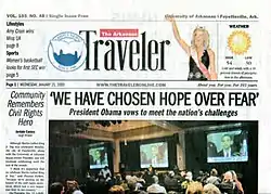 The Traveler is distributed free on campus and around the city of Fayetteville, Arkansas, and usually contains a mix of campus and local news coverage. Its Thursday edition is called the Weekender and provides a preview for the upcoming weekend.