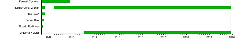 From there O'Brian worked as a singles wrestler, keeping the Ascension gimmick on his own for some time. Following O'Brian's victory over Briley Pierce and Sakamoto on the May 15, 2013 edition of NXT, Rick Victor appeared on the ramp, getting O'Brian's attention.[13] Victor would officially accompany O'Brian to the ring as his partner in the Ascension on the July 3 edition of NXT as O'Brian defeated Andy Baker. After winning a gauntlet match to determine the number one contenders for the NXT Tag Team Championship,[14] the Ascension defeated the team of Adrian Neville and Corey Graves on the October 2 edition of NXT to capture the titles.[15] On November 8 the two were renamed, Conor O'Brian renamed to Konnor and Rick Victor renamed to Viktor.