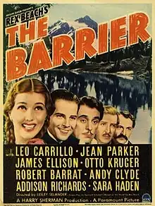 The Barrier is a 1937 American western adventure film directed by Lesley Selander and starring Leo Carrillo, Jean Parker and James Ellison.[1] It was produced and distributed by Paramount Pictures. It is based on the 1908 novel The Barrier by Rex Beach. The story was previously filmed by MGM as a silent film of the same title in 1926.[2] Location shooting took place in Mount Rainier National Park in Washington.