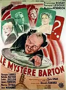 The Barton Mystery (French: Le mystère Barton) is a 1949 French mystery film directed by Charles Spaak and starring Françoise Rosay, Fernand Ledoux and Madeleine Robinson. It is based on the 1916 British play The Barton Mystery by Walter C. Hackett. It was the screenwriter Spaak's only attempt at directing a film.[1]