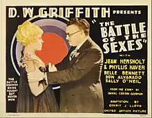 The Battle of the Sexes is a 1928 American comedy film directed by D. W. Griffith, starring Jean Hersholt, Phyllis Haver, Belle Bennett, Don Alvarado, and Sally O'Neil, and released by United Artists. The film was a remake by Griffith of an earlier film he directed in 1914, which starred Lillian Gish. Both films are based on the novel The Single Standard by Daniel Carson Goodman; the story was adapted for this production by Gerrit J. Lloyd.[4]