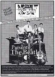 The Beatles at Abbey Road is a multimedia presentation hosted by Abbey Road Studios in London that focused on the recording career of the English rock band the Beatles.[1] It took place from 18 July to 11 September 1983, while part of the studios were undergoing renovation. The program included a guided tour of Abbey Road's Studio 2, where the Beatles recorded most of their music for EMI in the 1960s; a two-part video presentation narrated by disc jockey Roger Scott,[2] with interviews and rare archival footage; and previously unheard outtakes from the band's recording sessions.[3] The event was hosted by studio manager Ken Townsend and the shows took place three times a day.[4] Its staging reflected the elevation of Abbey Road (formerly EMI Studios) to the level of an English cultural location, as well as the enduring popularity of the Beatles, more than ten years after their break-up.[5] The Beatles at Abbey Road was a commercial success, with 22,000 tickets sold.[5]