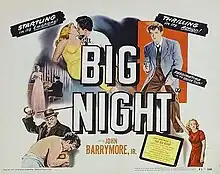 The Big Night is a 1951 American film noir directed by Joseph Losey, that features John Drew Barrymore (credited as "John Barrymore, Jr." in his first starring role), Preston Foster and Joan Lorring. The feature is based on a script written by Joseph Losey and Stanley Ellin, based on Ellin's 1948 novel Dreadful Summit. Hugo Butler and Ring Lardner, Jr. also contributed to the screenplay, but were uncredited when the film was first released.[2] Robert Aldrich, who had been an assistant director on other films directed by Losey, also has a brief uncredited appearance in a scene at a boxing match.[3]