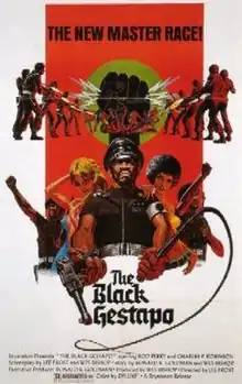 The Black Gestapo (also released as Ghetto Warriors) is a 1975 American crime film about a vigilante named General Ahmed, who starts an inner-city "People's Army" to protect the black citizens of Watts.[2][3][4] However, when the Army succeeds in chasing the mob out of town, Ahmed is replaced by his colleague Colonel Kojah, who reforms the movement into a National Socialist criminal organization in order to have complete control over the town.[5]
