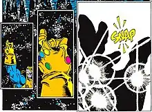 In the comic books published by Marvel Comics, the event on which the initial part of the Blip is based occurred during the 1991 The Infinity Gauntlet series and came to be called the Snap. While still carried out by Thanos, it was done in an effort to impress the female personification of Death, with whom he was enamored. Thanos collects the Infinity Gems[75] which he uses to create the Infinity Gauntlet, making himself omnipotent—and erases half the living things in the universe to prove his love to Death.[76] The heroes of Earth and other worlds do not become aware of these events until the Snap itself occurs, after which the surviving heroes band together against Thanos. The Snap and several related acts are quickly undone by Nebula and Adam Warlock.[77] Warlock reveals that Thanos has always allowed himself to be defeated because the Titan secretly knows he is not worthy of ultimate power. Thanos then joins Warlock as part of the Infinity Watch and helps him to defeat various threats to the universe.[78][79][80] As the Snap is reversed shortly after it occurs, it does not have the sort of long-term societal effects and repercussions as the Blip in the MCU. Instead the members of the Infinity Watch are each given one of the Gems, which included giving Thanos the Reality Gem.[81] Furthermore, because the Infinity Gems are recovered from Thanos immediately and are never destroyed, they continue to play a role in later storylines in the comic books.[82]