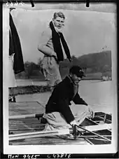 Cambridge were coached by Francis Escombe, Harold Rickett (who rowed three times between 1930 and 1932), and Peter Haig-Thomas (four-time Blue for Cambridge between 1902 and 1905). Oxford's coaches were John Houghton Gibbon (who had participated in the 1899 and 1900 races, and umpired the 1931 race), P. Johnson (who had rowed for Oxford in the 1927 race), A. E. Kitchin (who had rowed in the 1908 race) and W. P. Mellen (who was a Dark Blue in 1923 and 1924 races).[7] The race was umpired by former Cambridge rower Herbert Aylward Game who had represented the Light Blues in the 1895 and 1896 races.[8]