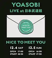 On October 1, 2022, the same day as the EP announcement, Yoasobi announced their one-off concert, titled Nice to Meet You in support of The Book 2. It was held between December 4 and 5 at Nippon Budokan, Tokyo, Japan, marking their first face-to-face concert since their debut in 2019.[23] The performance of "Kaibutsu" from the first day of the concert was lived via YouTube as part of the virtual online music festival YouTube Music Weekend.[24][25] In addition to in-venue, livestream was also available for the official fan club website Club Yoasobi via Stagecrowd.[26]