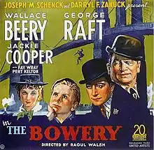 The Bowery is a 1933 American pre-Code Epic historical drama film set in the Lower East Side of Manhattan around the start of the 20th century directed by Raoul Walsh and starring Wallace Beery and George Raft. The supporting cast features Jackie Cooper, Fay Wray, and Pert Kelton.