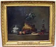 Manet was inspired to paint it after a painting of a brioche by 18th-century artist Jean Siméon Chardin was donated to the Louvre in Paris. In Manet's work the brioche is accompanied by peaches and plums. It is singular among Manet's still lifes for its formality, and mark the last time he would paint such an elaborate tabletop composition.[2]