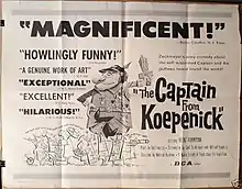 The Captain from Köpenick (German: Der Hauptmann von Köpenick) is a 1956 West German comedy film directed by Helmut Käutner and based upon the 1931 play The Captain of Köpenick by Carl Zuckmayer. The play was based on the true story of Wilhelm Voigt, a German impostor who masqueraded as a Prussian military officer in 1906 and became famous as the Captain from Köpenick. It was nominated for the 29th Academy Awards in the category Best Foreign Language Film.