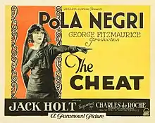 The Cheat is a 1923 American silent drama film produced by Famous Players–Lasky and distributed by Paramount Pictures, and is a remake of Cecil B. DeMille's 1915 film of the same name using the same script by Hector Turnbull and Jeanie MacPherson. This version stars Pola Negri and was directed by George Fitzmaurice.[1][2][3]