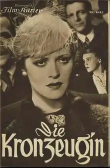 The Chief Witness (German: Die Kronzeugin) is a 1937 German crime drama film directed by Georg Jacoby and starring Iván Petrovich, Sybille Schmitz and Sabine Peters.[1] [2] [3] It was shot at the Babelsberg Studios in Berlin.[4] The film's sets were designed by the art directors Otto Hunte and Willy Schiller. Location shooting took place in the Krkonose Mountains in Czechoslovakia and Zugspitze in Bavaria.