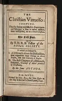 The Christian Virtuoso (1690) was one of the last books published by Robert Boyle,[1] who was a champion of his Anglican faith. This book summarised his religious views[2] including his idea of a clockwork universe created by God.[3][4] Boyle was a devout Anglican, and with the rise of science and reason during his lifetime, was troubled by increasing atheism. This spurred him to write about his belief of science and religion supporting each other.[5]