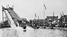 The previous Chutes locations boasted a variety of exciting attractions that captivated visitors. Among them were the beloved Railway, merry-go-round, Circle Swing, shooting gallery, and photo studio. With the establishment of the new Chutes location, a fresh wave of amusements emerged, including the thrilling "Dante's Inferno" labyrinth, complete with hills and drops. Notably, the labyrinth featured the heart-pounding "Devil's Slide," where patrons could ascend via an escalator and then slide down steep slopes on small mats. Another exhilarating attraction was the human roulette wheel, where riders spun faster and faster until the centrifugal forces propelled them into the outer gutter. Additionally, visitors could enjoy their time in the lively Dancing Pavilion, while the outdoor screen showcased captivating motion pictures for everyone's entertainment..[9]