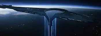 One of the most significant elements of the film is the fictional U.S. military space station NOMAD, which was noted for its distinctive visual design and sound effects. Edwards revealed that it took the entirety of the lockdowns caused by the COVID-19 pandemic to design it, describing the ship as "a bird of prey and an all-seeing eye in the sky, always looking at everybody. So we kept playing with those two shapes and merging them in a way until it just felt right." Erik Aadahl and Ethan Van der Ryn, who worked with Edwards on Godzilla (2014), provided the sound effects work for the ship, described as "a dance, is probably the nice way to say it, between music and sound, and it's never a fight". The assembly cut of the film, which ran for 5 hours, did not use any temp tracks for the music and just the sound design, which Edwards likened to that of the talkies during the late-1920s.[28] Because of this, it was decided that no music be added to the film throughout the entire editing process in order to get the pacing and story structure right in an efficient manner. Edwards called the experience "super interesting. Part of me thinks that I would do that again, because it puts a lot of pressure on the sound design, but then you're not hiding behind music to save the storytelling."[29]
