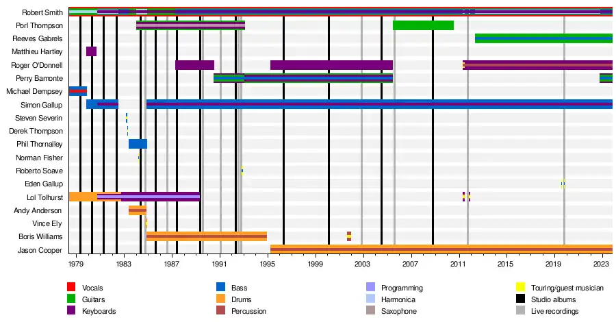 The Cure are an English alternative rock band from Crawley. Formed in May 1978,[1][2][3] the group originally consisted of vocalist, guitarist and keyboardist Robert Smith (the only constant member), bassist Michael Dempsey and drummer Lol Tolhurst. The current lineup includes Smith, bassist Simon Gallup (from 1979 to 1982, and since 1984), keyboardist Roger O'Donnell (from 1987 to 1990, 1995 to 2005, and since 2011), guitarist and keyboardist Perry Bamonte (from 1990 to 2005, and since 2022), drummer Jason Cooper (since 1995) and guitarist Reeves Gabrels (since 2012).