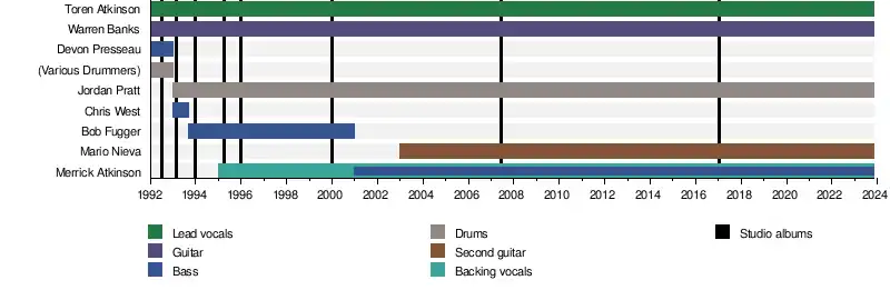 The original three members of the band, at the January 1992 formation, were Toren Atkinson, Warren Banks and Quentin Rogers. Quentin, though, never appeared on any of their releases, nor played at any of their public performances. The first bass player to appear with the band at a show was Devon Presseau.[43] The band has gone through several bassists and drummers since its inception. Thomas R. Falk has toured and played with the band as a second guitarist.