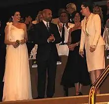 Only Valentino Garavani, who designed the black evening gown Miranda wears during the museum benefit scene, chose to make an appearance.[37] Coincidentally, he was in New York City during production and Finerman dared Field, an acquaintance, to ask him personally. Much to her surprise, he accepted.[38] Other cameos of note include Heidi Klum as herself and Weisberger as the twins' nanny.[39] Streep's daughter's film debut as a barista at Starbucks was cut.[40] Gisele Bündchen agreed to appear in the film only if she did not play a model.[36]