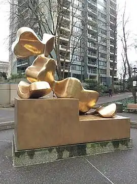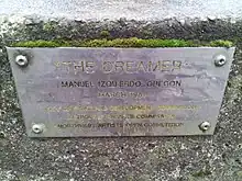 Manuel Izquierdo's The Dreamer was funded by the Portland Development Commission and installed at Pettygrove Park (Southwest 3rd Avenue between Market Street and Harrison Street) in downtown Portland in 1979.[2][3] The Oregon Encyclopedia contributor Roger Hull described the sculpture as a "flowing, abstract form poised on a geometric base sited in a pool of water. Organic and voluptuous, it is a modern river goddess. Izquierdo's faultlessly drop-welded seams (internal to the work and thus invisible) give the piece a taut clarity despite its sensuousness."[4] Izquierdo purchased and cleaned surplus Navy bronze,[5] then filled the sculpture with foam so that falling rain would create a "gentle sound like a kettledrum", rather than a ringing sound produced from rain hitting a hollow structure. He has said the work "speaks of hope, of beauty and serenity, of love, and for a better life in our midst".[2]
