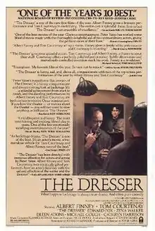 The Dresser is a 1983 British drama film directed by Peter Yates and adapted by Ronald Harwood from his 1980 play The Dresser. It tells the story of an aging actor's personal assistant struggling to keep his employer's life together. The film stars Albert Finney, Tom Courtenay, Zena Walker, Eileen Atkins, Michael Gough, and Edward Fox.
