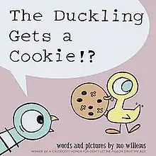 The Duckling Gets a Cookie!? is a 2012 picture book by Mo Willems. It is about a duckling that asks for, and receives, a cookie, a pigeon that complains about it, but is then flummoxed when the duckling passes the cookie to him.