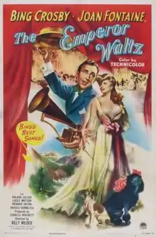 The Emperor Waltz (German: Ich küsse Ihre Hand, Madame) is a 1948 American musical film directed by Billy Wilder, and starring Bing Crosby and Joan Fontaine.[4][5] Written by Wilder and Charles Brackett, the film is about a brash American gramophone salesman in Austria at the turn of the twentieth century who tries to convince Emperor Franz Joseph to buy a gramophone so the product will gain favor with the Austrian people. The Emperor Waltz was inspired by a real-life incident involving Franz Joseph I of Austria. Filmed in Jasper National Park in Canada,[6] the picture premiered in London, Los Angeles, and New York in the spring of 1948, and was officially released in the United States July 2, 1948. In 1949, the film received Academy Award nominations for Best Costume Design and Best Music, as well as a Writers Guild of America Award nomination for Best Written American Musical.[7]