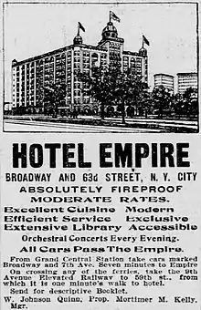The Empire Hotel is a boutique hotel located along West 63rd Street (at Broadway), in the New York City borough of Manhattan. The Empire Hotel has 426 guestrooms, including 50 suites.