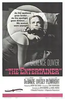 The Entertainer is a 1960 British kitchen sink drama film directed by Tony Richardson, produced by Harry Saltzman and adapted by John Osborne and Nigel Kneale from Osborne’s stage play of the same name.[7] The film stars Laurence Olivier as Archie Rice, a failing third-rate music-hall stage performer who tries to keep his career going even as the music-hall tradition fades into history and his personal life falls apart.[8] Olivier was nominated for an Oscar for Best Actor in a Leading Role.[9]