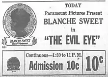 The Evil Eye is an extant 1917 American silent drama film produced by Jesse Lasky and distributed by Paramount Pictures. It was directed by George Melford and stars Blanche Sweet. A copy is preserved at the Library of Congress.[1][2][3][4]