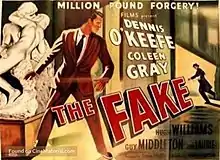 The Fake is a 1953 British crime mystery starring Dennis O'Keefe and Coleen Gray. Directed by Godfrey Grayson, it follows an American detective trying to prevent the theft of a priceless painting from the Tate Gallery in London.[1] Hugh Williams and Guy Middleton appear in support.[2]