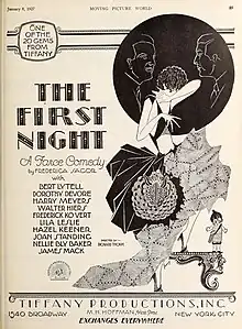 The First Night is a 1927 American silent comedy film directed by Richard Thorpe and starring Bert Lytell, Dorothy Devore, and Harry Myers.[1] It was produced and distributed by the independent Tiffany Pictures. The film's sets were designed by the art director Edwin B. Willis.