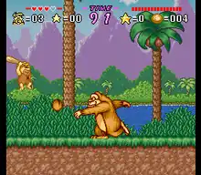 The earlier zones in the game can only be cleared by first defeating specific Water Buffalo members (most of which appeared at some point in the cartoon series) by winning them in a race located at a stadium.[4] Races use the game's RAM to simulate variables like forward speed, leaning angle, maximum terrain speed, and vertical speed. These events must be found as their items are crucial to the success of the quest.[4] If any character goes to the stadium, the race can be practiced. The person who operates the racing mini-game will give an item to both Fred and Barney after defeating him, so that they can go the next world.